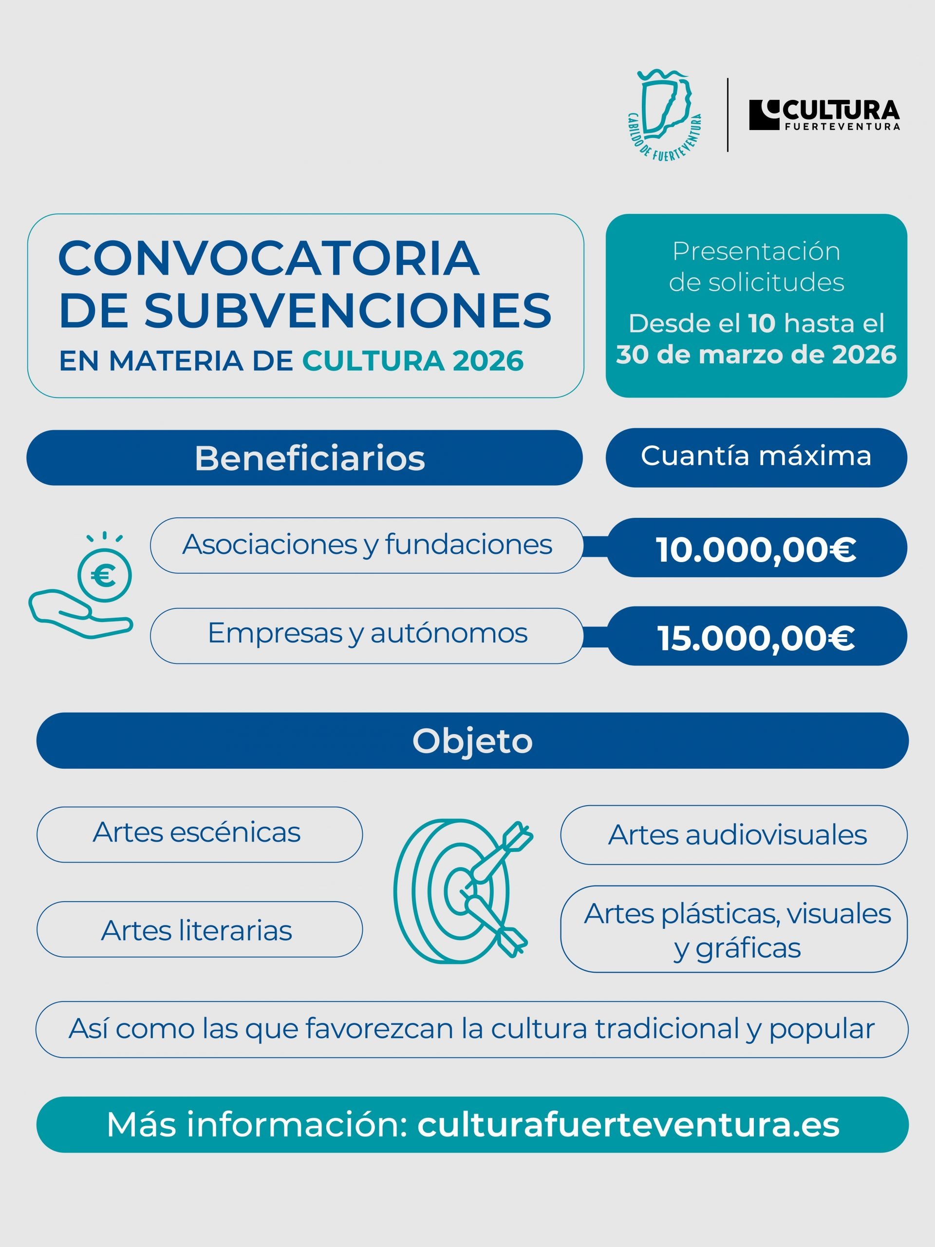 - Las organizaciones socioculturales que desarrollen actividades y proyectos culturales en Fuerteventura podrán recibir hasta 10.000 euros.